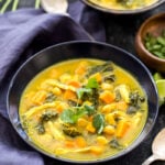 Heat the olive oil in a large pot over medium-high heat. Stir in the onion, garlic and ginger and cook for 2-3 minutes. Add in the carrots, sweet potato and kale and cook for another 3 minutes until the kale starts to wilt.